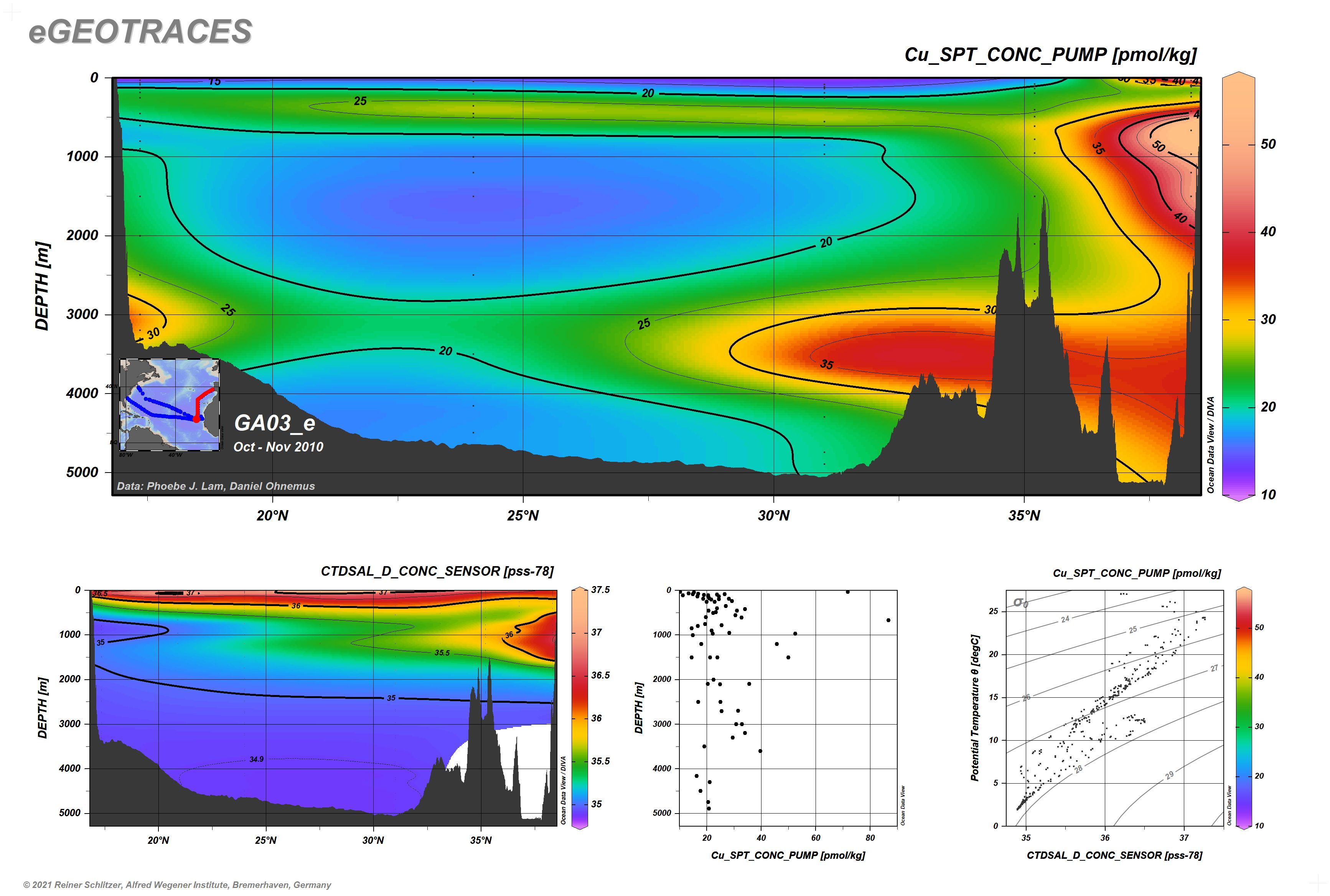 Other tracers along this section: Ag small particulate, total | Al dissolved | Al large particulate, total | Al small particulate, total | Ba dissolved | Ba large particulate, total | Ba small particulate, total | bSi large particulate, total | bSi small particulate, total | Cd dissolved | Cd large particulate, total | Cd small particulate, total | Ce dissolved | CFC-11 | CFC-12 | CFC113 | Co dissolved | Co large particulate, total | Co small particulate, total | CTDSAL | Cu dissolved | Cu large particulate, total | delta Cd_114_110 | delta DIC_13_12 | delta Fe_56_54 | delta H2O_18_16 | delta H2O_2_1 | delta He_3_4 | delta Nitrate_15_14 | delta Zn_66_64 | Dy dissolved | epsilon Nd_143_144 | Er dissolved | Eu dissolved | Fe dissolved | Fe large particulate, total | Fe small particulate, total | Fe soluble | Fe_II dissolved | Ga dissolved | Gd dissolved | Helium | Hg dissolved | Ho dissolved | L1Cu dissolved | L1Cu_D_LogK | L1Fe dissolved | L1Fe_D_LogK | L2Fe dissolved | L2Fe_D_LogK | La dissolved | Lu dissolved | Mn dissolved | Mn large particulate, total | Mn small particulate, total | Nd dissolved | Nd large particulate, total | Nd small particulate, total | Neon | Ni dissolved | Ni large particulate, total | Ni small particulate, total | Nitrate | Nitrite | Oxygen (CTD) | Oxygen (Winkler) | P large particulate, total | P small particulate, total | Pa_231 dissolved | Particle Mass large particulate, total | Particle Mass small particulate, total | Pb dissolved | Pb large particulate, total | Pb small particulate, total | Pb_206_207 ratio, dissolved | Pb_208_207 ratio, dissolved | Phosphate | PIC large particulate, total | PIC small particulate, total | POC large particulate, total | POC small particulate, total | Potential Temperature | Pr dissolved | Ra_223 dissolved | Ra_224 dissolved | Ra_226 dissolved | Ra_228 dissolved | Salinity | SF6 | Silicate | Sm dissolved | Tb dissolved | Th large particulate, total | Th small particulate, total | Th_228 dissolved | Th_228 small particulate, total | Th_230 dissolved | Th_232 dissolved | Th_234 small particulate, total | Th_234 total | Ti large particulate, total | Ti small particulate, total | Tm dissolved | Total Alkalinity | Tritium | V large particulate, total | V small particulate, total | Y dissolved | Y large particulate, total | Y small particulate, total | Yb dissolved | Zn dissolved