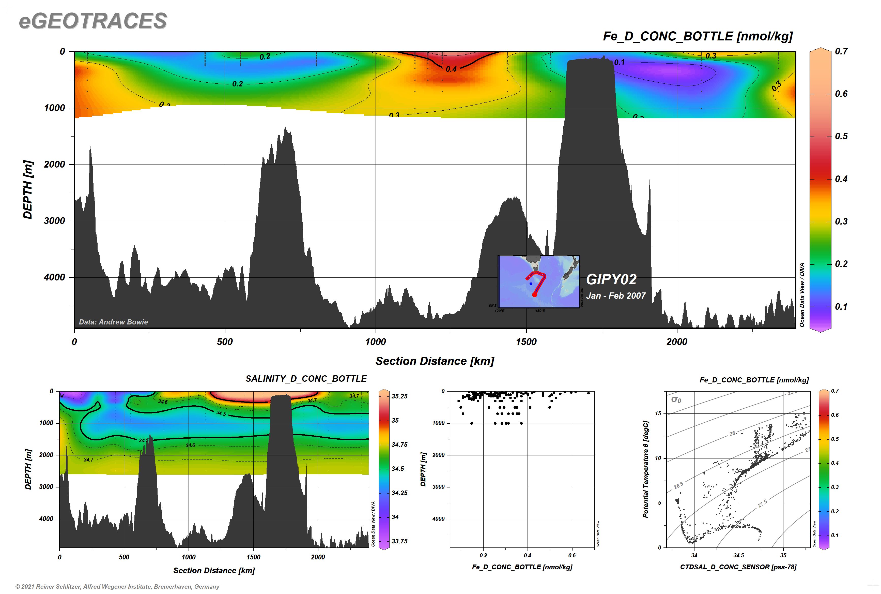 Other tracers along this section: Al dissolved | Cd dissolved | CTDSAL | Cu dissolved | NH4 dissolved | Nitrite | NO2+NO3 | Oxygen (Winkler) | Pb dissolved | Phosphate | Potential Temperature | Salinity | Silicate | Zn dissolved