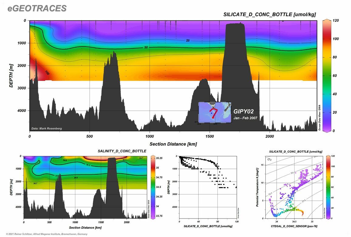 Other tracers along this section: Al dissolved | Cd dissolved | CTDSAL | Cu dissolved | Fe dissolved | NH4 dissolved | Nitrite | NO2+NO3 | Oxygen (Winkler) | Pb dissolved | Phosphate | Potential Temperature | Salinity | Zn dissolved