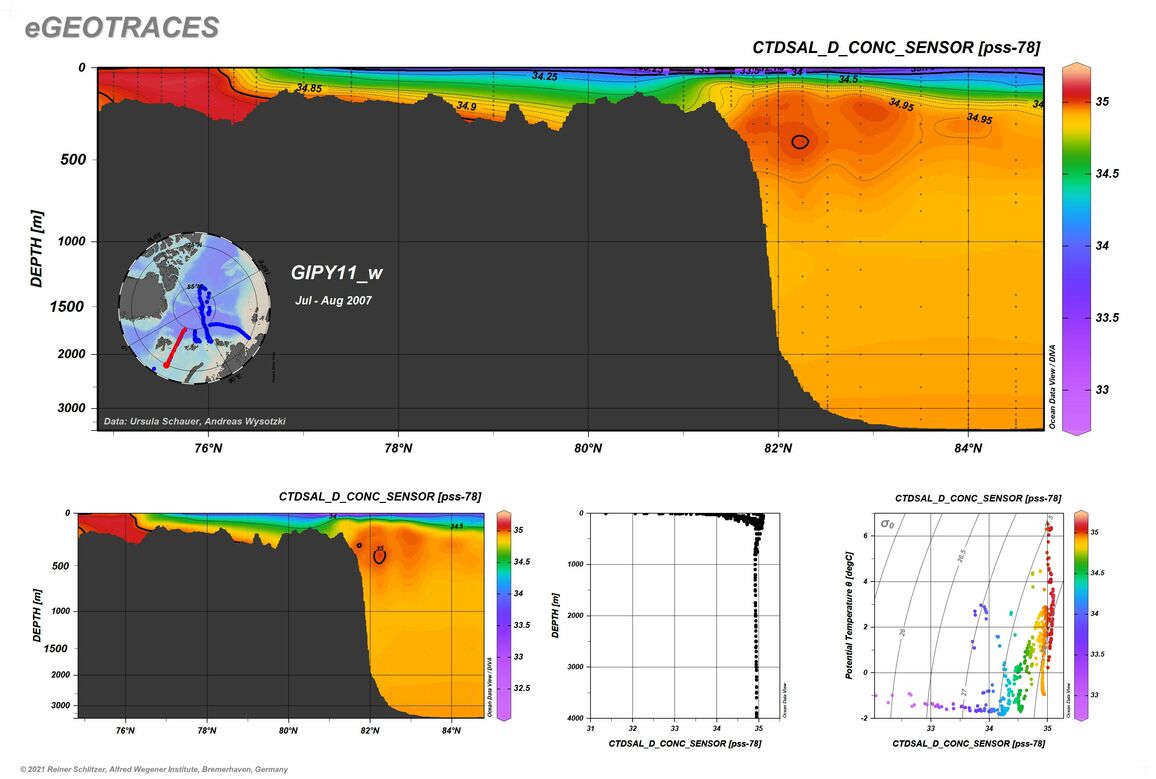 Other tracers along this section: Al dissolved | Ba dissolved | Cs_137 dissolved | delta H2O_18_16 | Dissolved Inorganic Carbon | Fe dissolved | Mn dissolved | Nitrite | NO2+NO3 | Oxygen (CTD) | Pb_210 dissolved | Phosphate | Po_210 dissolved | Potential Temperature | Pu_239_Pu_240 dissolved | Silicate | Th_234 total | Total Alkalinity