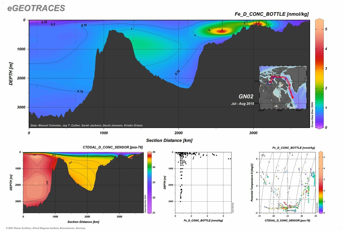 Other tracers along this section: Al total particulate | Ba total particulate | Cd dissolved | Cd total particulate | Co total particulate | CTDSAL | Cu dissolved | Cu total particulate | delta DIC_13_12 | delta H2O_18_16 | delta Nitrate_15_14 | delta Nitrate_18_16 | epsilon Nd_143_144 | Fe total particulate | Ga dissolved | Mn dissolved | Mn total particulate | Ni dissolved | Nitrate | Oxygen (CTD) | P total particulate | Pb dissolved | Pb total particulate | pH Total Scale | Phosphate | Potential Temperature | Silicate | Total Alkalinity | V total particulate | Zn dissolved | Zn total particulate